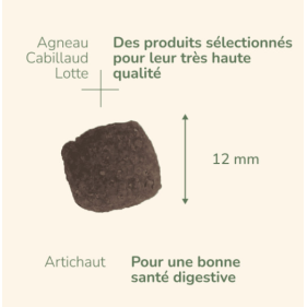 Une sélection d’ingrédients gourmets pour le plaisir des chiens à chaque repas (agneau du Sud-Ouest de la France, poissons blancs sauvages (cabillaud, lotte), patate douce)
