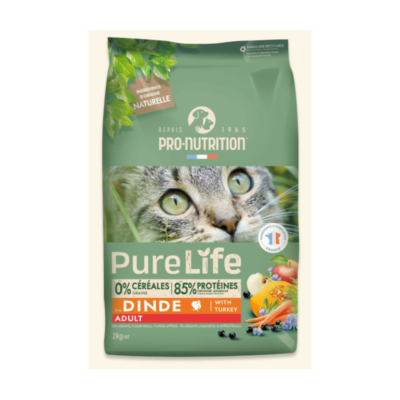 Protéines animales déshydratées (33% mini) (canard mini 4%, dinde mini 4%, poulet, porc). Fécule de pomme de terre. Pois. Tapioca. Graisse de volaille. Fibres de féveroles. Graines de lin. Fibres de pomme. Hydrolysats de protéines animales. Graisse de canard. Carottes déshydratées. Méthionine. Artichaut. Huile de poisson. Autolysats de poissons (0,5%). Chlorure d'ammonium. Grenade. Cassis. Levure de bière. Sel de mer. Argile. Taurine. Algues. Fructo-oligosaccharides. Papaye. Canneberge. Ananas (tige). Acérola. Yucca. Aloe vera. Extraits de romarin. Vitamines et oligo-éléments.